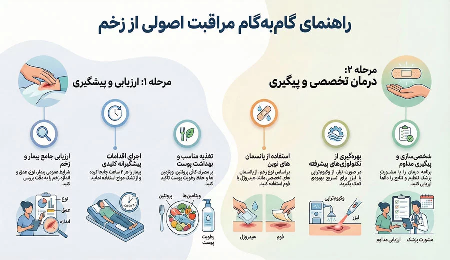 مراقبت صحیح و علمی از زخم، به خصوص در مناطق شمال تهران مانند فرمانیه، الهیه، پاسداران و دزاشیب، نیازمند یک رویکرد برنامهریزیشده و چندمرحلهای است. بیتوجهی به نکات کلیدی، گاهی به پیشرفت زخم و حتی بستری طولانیمدت منجر میشود. اما اگر مراحل اصولی مراقبت و درمان را گامبهگام دنبال کنید، قابلیت کنترل و حتی بهبود زخمهای مقاوم به شکل چشمگیری افزایش مییابد. راهنمای زیر حاصل تجربه کلینیکهای مجهز منطقه و تلفیقی از توصیههای روزٍ متخصصان زخم ایران و جهان است. با دقت این مراحل را اجرا کنید تا ضمن پیشگیری از عوارض جدی، بهترین شانس ترمیم و بازیابی سلامت برای خود یا عزیزانتان رقم بزنید.